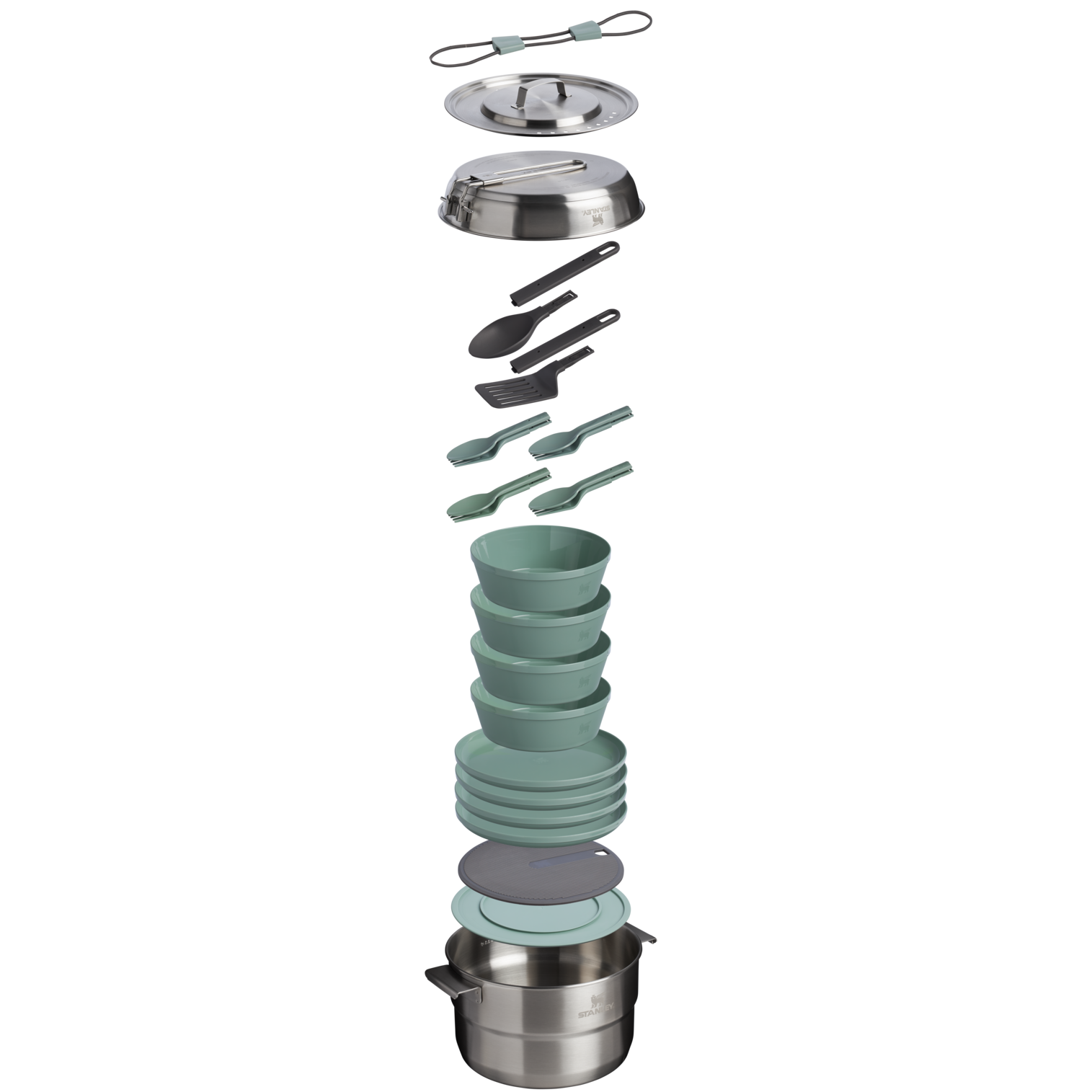 The Wildfare Core Fry Pan Cookset is a fully stocked kitchen. packed up neatly to go. This 26-piece set includes a 4-quart pot. 8-inch tri-ply fry pan. cooking utensils. and nonslip cutting board with a removable trivet. The four-person tableware set includes high-walled plates. stacking bowls. and dual-end cutlery for outdoor hosting with the comfort of home.